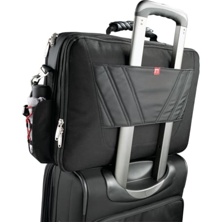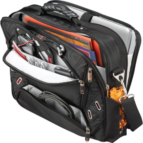 Includes designated laptop-only section that unfolds to lay flat on the X-ray belt to increase your speed through security. Back zippered compartment holds up to 17" laptops and has separate zippered pocket. Main zippered compartment for file dividers and mesh pocket organization. Front zippered pocket holds the removable techtrap elastic organizer panel, media pocket with earbud port and deluxe organization. Front lower and hidden pockets for valuables. Elastic shock cord on exterior side pocket for additional storage. Molded handle and padded, detachable, adjustable shoulder strap. Back panel designed to slip over trolley handles. Exterior TSA hangtag for guideline information. Signature elleven lining and hardware. Free run charges for embroidery up to 10,000 stitches.