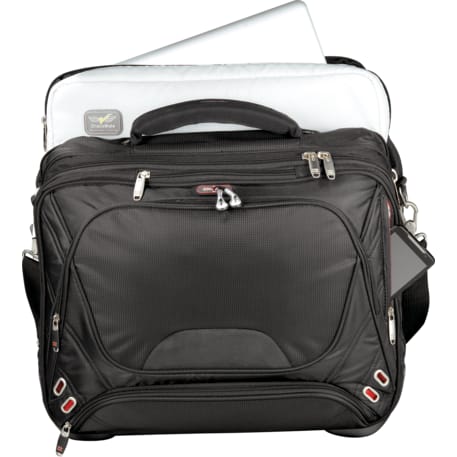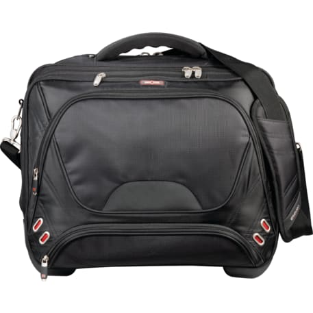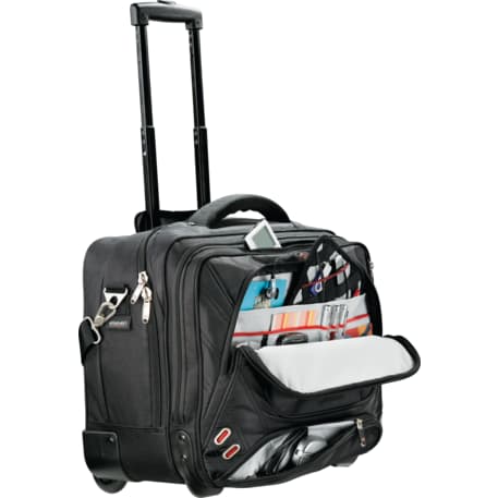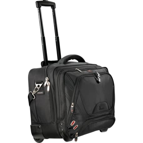 Large main zippered compartment includes removable padded TSA-compliant laptop sleeve expediting airport security. Holds most 17" laptops. Main zippered compartment is spacious enough for an overnight trip. Additional zippered compartment for file dividers and mesh pocket organization. Front zippered pocket includes removable techtrap organizer panel and deluxe organization. Separate nylex-lined front top media pocket with earbud port. Front lower and hidden pockets for valuables. Recessed telescoping handle extends to 27". Inline wheels with corner protectors. Molded grab handle with neoprene padding. Padded, detachable, adjustable shoulder strap. Back panel designed to slip over trolley handles of a wheeled upright. Exterior TSA hangtag for guideline information. Signature elleven™ lining and hardware. Free run charges for embroidery up to 10,000 stitches.
