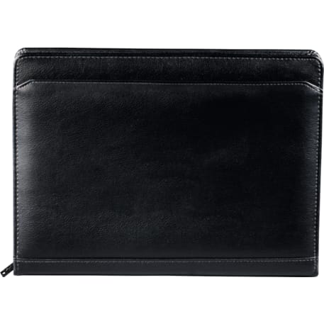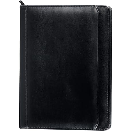 The Manchester Zippered Padfolio features a zippered closure, front document pocket, accordion business card file and multiple file pockets. Card holder with closure can also serve as USB holder for flash memory devices. Includes 8.5" x 11" writing pad with 30 pages of white lined paper and built-in solar calculator. Elastic pen loop. Refills available at leedsworldrefill. Refill item number 9091-01. Pen not included.