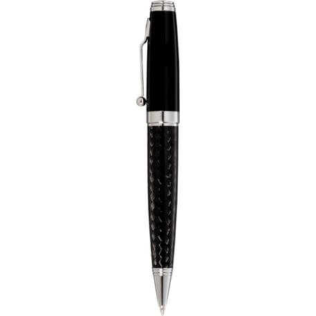 High gloss black enamel upper barrel with carbon fiber detailing in lower barrel. Highlighted with chrome accents. Twist action mechanism. Pen includes premium black ink cartridge. 1.0mm pen tip. Laser finish is shiny chrome.