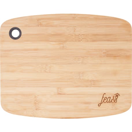 The natural color bamboo cutting board features a thumb hole with silicone ring for ease of handling and provides a perfect location to hang the cutting board when not being used. Its slim profile design makes it easy to store in a drawer or where space is at a premium. Cutting board measures 15" x 12" x .6". Due to the nature of the bamboo material, variations in laser imprinting quality may occur.