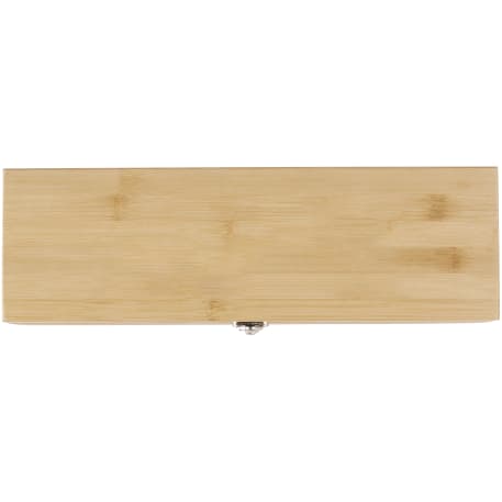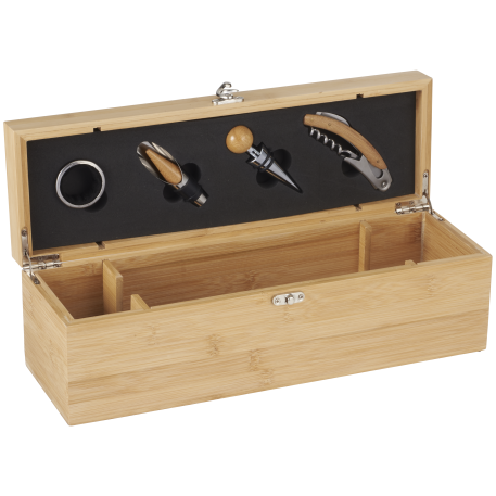 The timeless bamboo case turns a bottle of wine into a memorable gift. Includes a foil opener as well as bamboo accented stopper, pourer and corkscrew. Due to the nature of the bamboo material, variations in laser imprinting quality may occur.