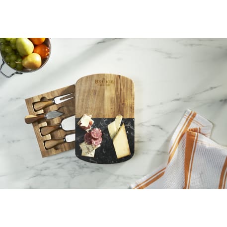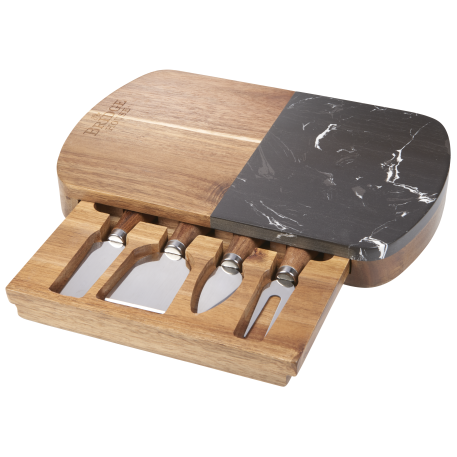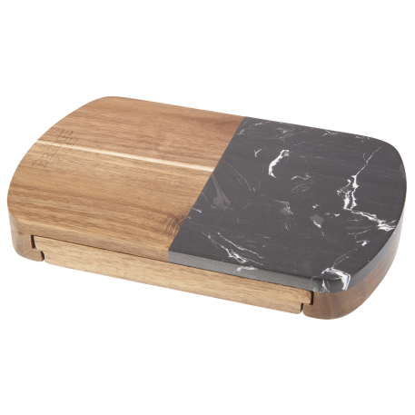 This chic cheese cutting board set is the perfect fit for any home. It is crafted from black marble and acacia wood. Cheese cutting tools easily store in the built in drawer under the cutting board. Due to the nature of the natural material there may be variations in marble pattern and laser engraving. Wood color will have natural variations.