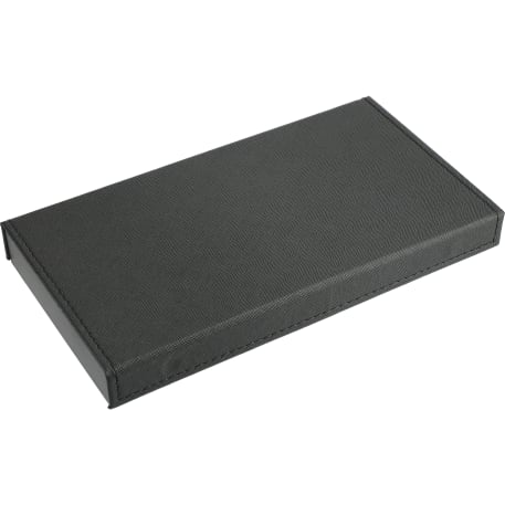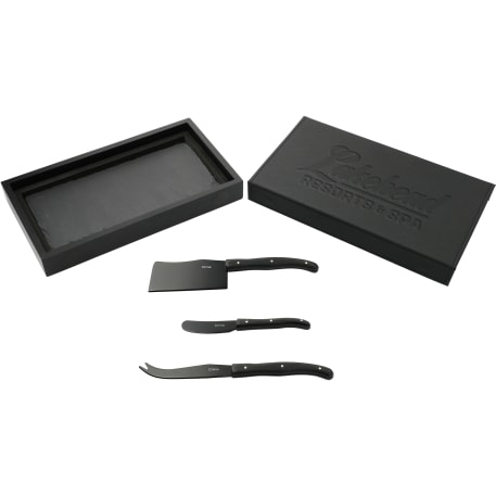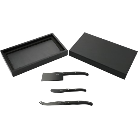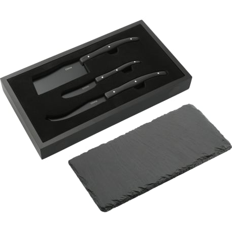 The Modena Black Cheese & Serving Set includes a slate serving board with a set of three cheese knives. This set comes in a wooden box that is convenient for both storage and presentation. The slate board measures 10.23" x 5.12" x 0.2". The knives measure 9.16" x 0.94" x 0.55" / 8.46" x 1.73" x 0.55" / 6.3" x 0.78" x 0.5".