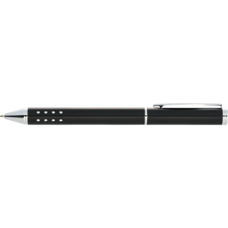 Exclusive Leed's design. Unique brass barrel cutouts reveal high shine chrome accents. Twist action mechanism. Pen includes premium black ink cartridge and 1.0mm pen tip. Laser 360 is available on this style. Laser finish is shiny chrome.