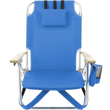 Sit in style with the easy to carry Beach Chair. With a 300lb. capacity, the sturdy aluminum frame with wooden armrests and a detachable pillow make this the perfect chair for a day at the beach.