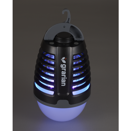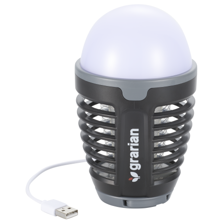 Keep the pesky bugs away with the Mosquito Repellent Night Lamp. The lamp features a bottom light, a bug zapping light, and a hanging hook. The both lights are activated by touch on the top of the lamp. The bottom bulb is a bright LED light comparable to a filament bulb. The blue light in the center surrounded by a safe guard has a special wavelength that attracts insects to the inner grid that shocks them with 2000V of electricity. They then fall to the inner space of the lamp there they can be swept away with the included brush. Perfect for all outdoor areas, the Mosquito Repellant Night Lamp is rechargeable by USB. One 18650 lithium battery included.