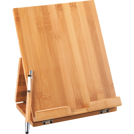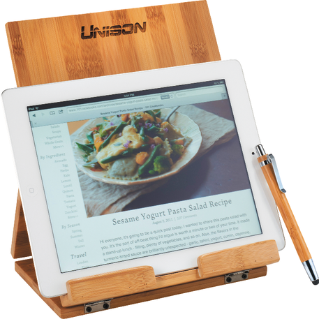 Whether preparing a new dish or just enjoying your morning coffee in the kitchen, this 2-piece set is the perfect accompaniment. Bamboo stand is perfect for propping up any touch screen tablet or favorite recipe book. Bamboo ballpoint stylus keeps sticky fingers off of tablet screen and offers ballpoint pen option for making any notes. Ballpoint stylus has black ink. Due to the nature of the bamboo material, variations in laser imprinting quality may occur.