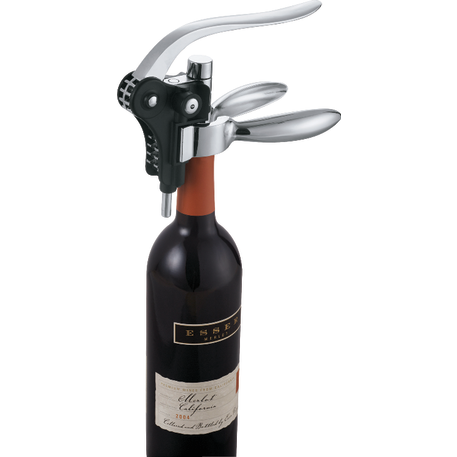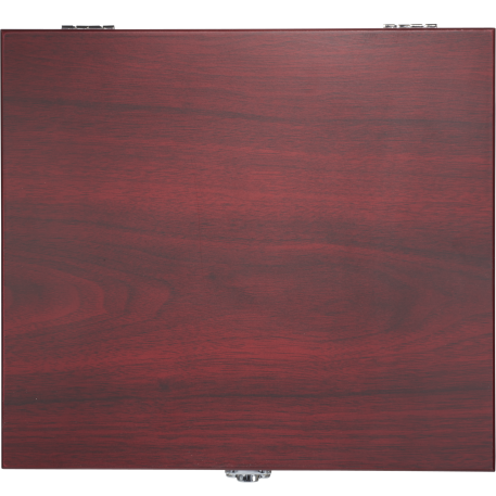 Nine-piece wine set features a cherry polished wooden case for compact storage. Includes an ergonomic bottle opener, foil seal cutter, drip ring, thermometer, pourer, two wine stoppers, and two replacement corkscrew bits.