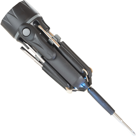 Get your senses ready for this 8-in-One Screwdriver Flashlight. Perfect to keep around the house, this tool has 1 LED light, 3 Phillips head, 3 Flat head, and a small eye glass tool with screw on cap. Press the button once for the flashlight, and again for the LED to illuminate the tools. 3 AAA batteries included.