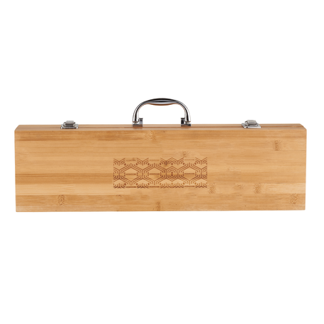 Grill out in style with this 3-piece premium BBQ set. Bamboo case is both functional and decorative. Tools are full size, durable stainless steel with bamboo handles. Due to the nature of the bamboo material, variations in laser imprinting quality may occur.