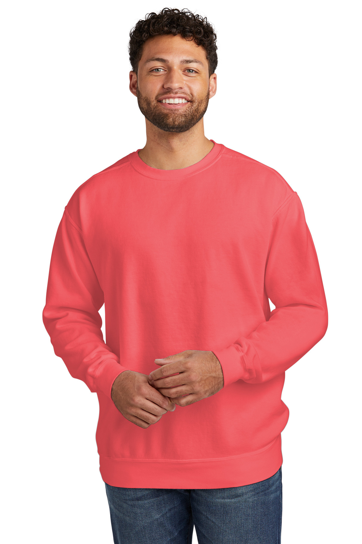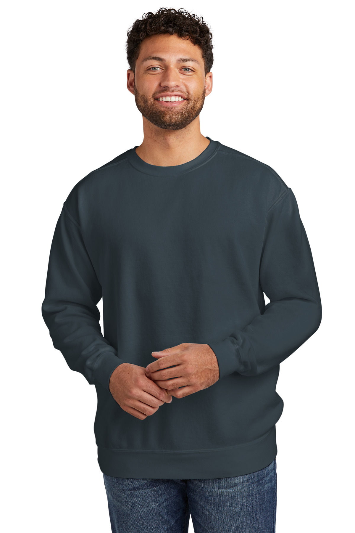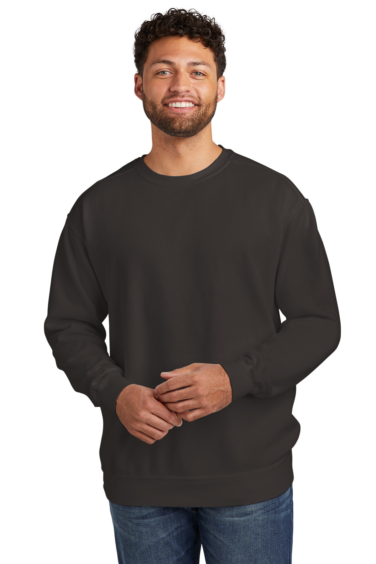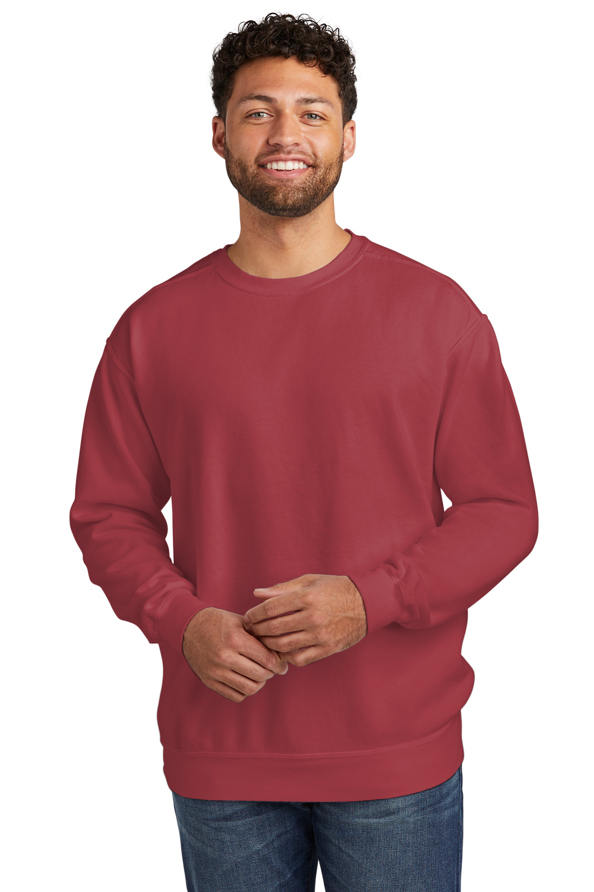 9.5-ounce 80/20 ring spun cotton/poly Soft-washed garment-dyed fabric 1x1 rib knit on collar cuffs and hem Double-needle collar Twill-taped back neck Rolled forward shoulder Back patch Twill label Double-needle neck shoulder armhole cuffs and hems