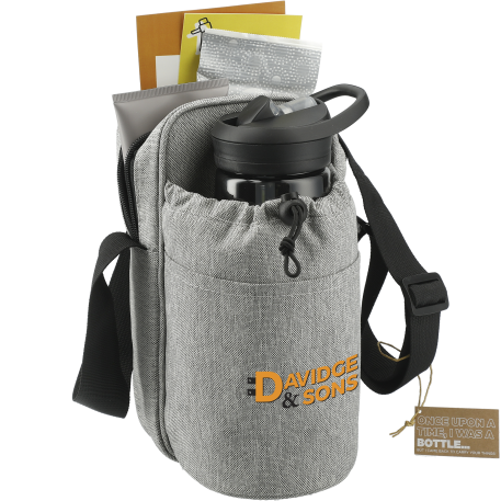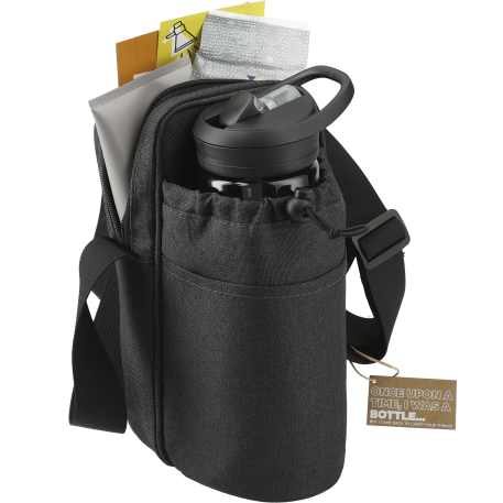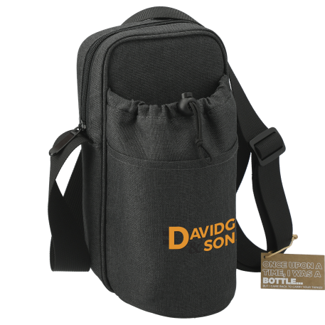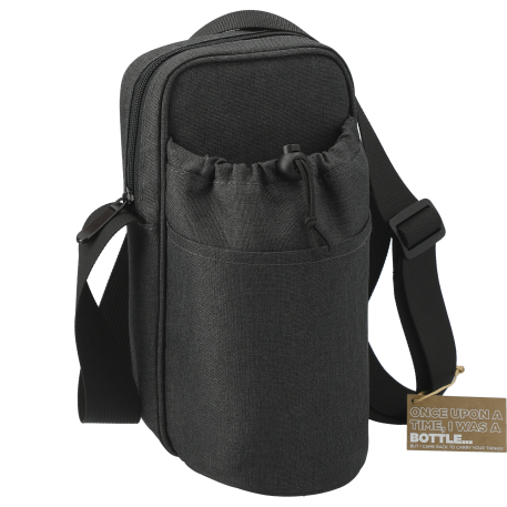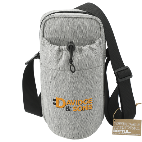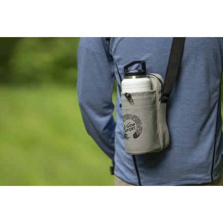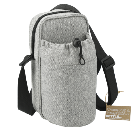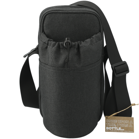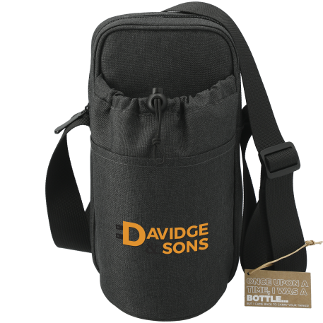 The Traver RPET Adjustable Bottle Sling Cooler w/ Pouch provides convenient, hands-free carrying for drinkware bottles. The insulated cooler liner helps keep your beverages cold while preventing condensation on sport bottles. An integrated toggle holds drinkware in place while inside the pouch. The zippered pocket features a built-in card organizer as well as elastic bands to store your accessories. Features an adjustable strap for on-the-go comfort. This product’s main material is RPET 600d and its black lining and webbing are RPET 210d, which is made from recycled plastics, such as water bottles. Note: PEVA lining of pouch is not made with recycled materials. Includes interior ID label. Disclaimer: There may be minor variations in color of the actual product due to the nature of the fabric dyes, weaves and printing. Bottle sold separately. The maximum diameter of the bottle that can be inserted into the bottle holder is 3.5”.