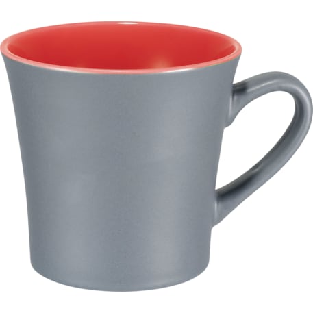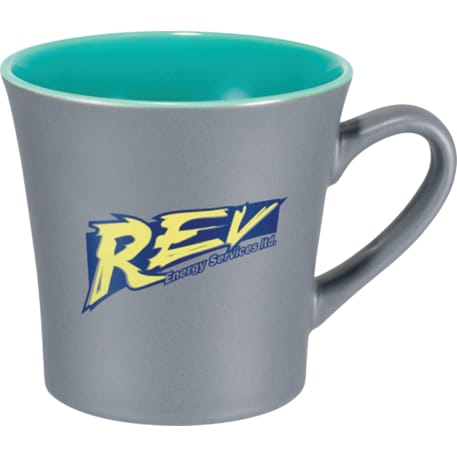 Ceramic mug with smooth matte gray outer wall and brightly colored high-gloss inner wall. Choose between color imprinting or our cutting edge dishwasher safe laser decorating method. Exclusive Leed's design. 12oz.