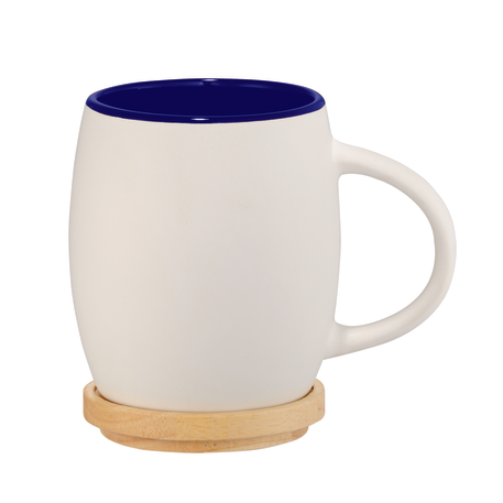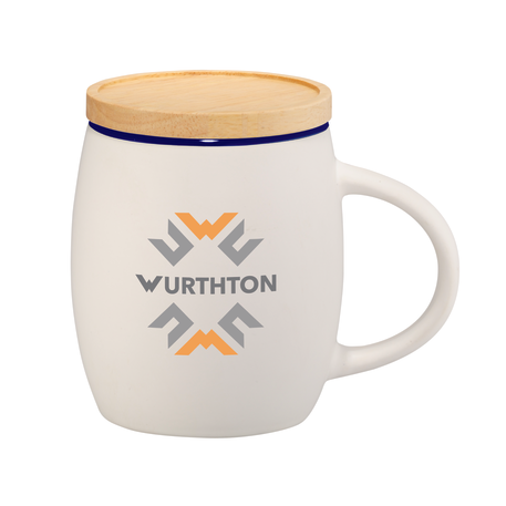 Cozy ceramic mug with matte finish body. Natural wooden lid also works as a coaster. Choose between color imprinting or our new cutting edge dishwasher safe laser decorating method. Leed's Exclusive. 15oz.