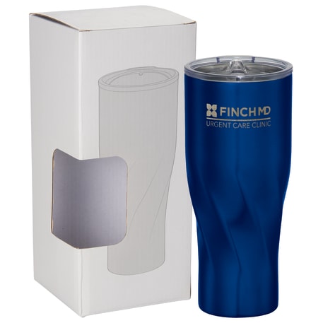 Do not miss the most trendy tumbler of the year. Durable, double-wall stainless steel vacuum construction with copper insulation, which allows your beverage to stay cold for 24 hours and at least 8 hours for hot beverages. The construction also prevents condensation on the outside of the tumbler. Push-on two piece lid with Tritan™ swivel anti-spill closure, pinch the 2 axis joints slightly to remove the top part of the lid for easy cleaning. Wide opening for comfortable filling and pouring. Design features the spinning, geometric bottom. Leed's Exclusive. 30oz. Drinkware is 1625-09. “For additional protection, all Drinkware pieces will be individually polybagged and inserted in the gift box.”