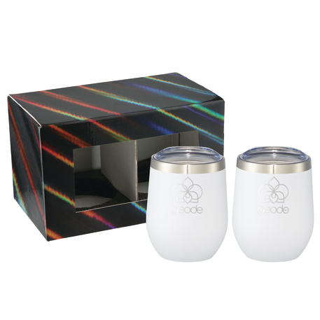 Includes 2 Corzo cups 1625-53. Durable, double-wall stainless steel vacuum construction with copper insulation, which allows your beverage to stay cold for 24 hours and hot for at least 6 hours. The construction also prevents condensation on the outside of the piece. Leed's Exclusive 12oz. The product comes in a holographic gift box as shown in the image. Gift Box is not decorated.