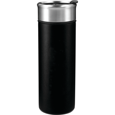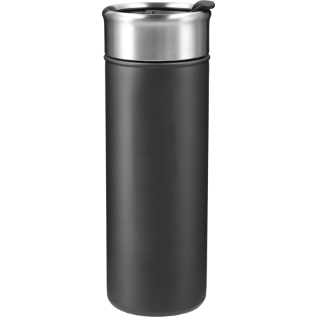 Double-wall, copper vacuum insulated, stainless steel construction. Keeps drinks hot for 8 hours and cold for 24 hours. Stainless, screw-on lid with flap-seal closure. Fits most standard car cup holders. 18oz.