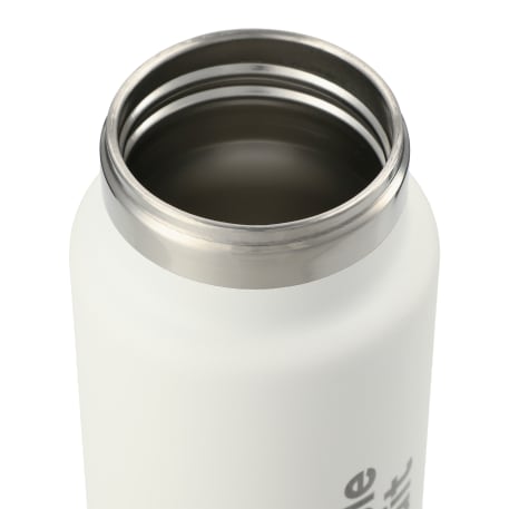 All stainless steel product with silicone gasket. Durable, powder spray coating. Double-wall stainless steel vacuum construction with copper insulation, which allows your beverage to stay cold for 48 hours and at least 12 hours for hot beverages. The construction also prevents condensation on the outside of the bottle. Durable, screw-on, spill proof lid with easy carry metal handle. Wide mouth opening for easy cleaning and filling. Leed's exclusive. 20oz.