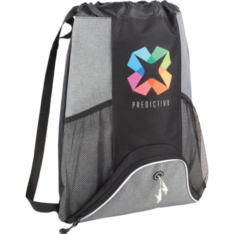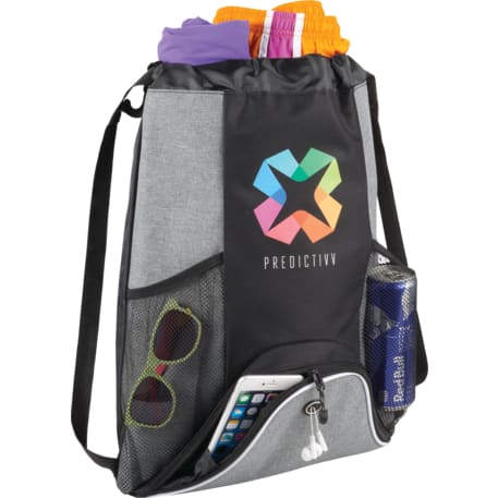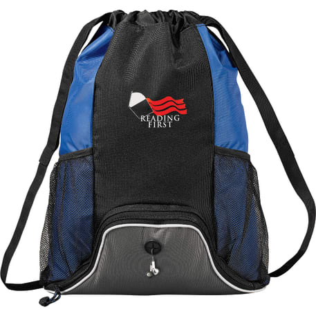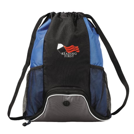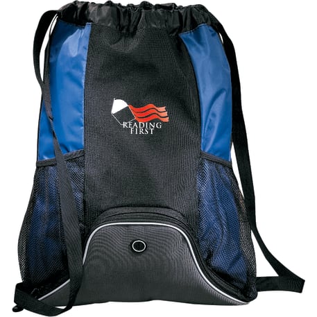 Open main compartment includes shoulder straps, which also cinches the bag shut. Zippered front pocket with side gussets and a headphone port. Large front mesh pouches with elastic bands.Disclaimer: There may be minor variations in color of the actual product due to the nature of the fabric dyes, weaves and printing.