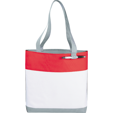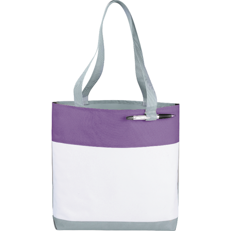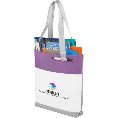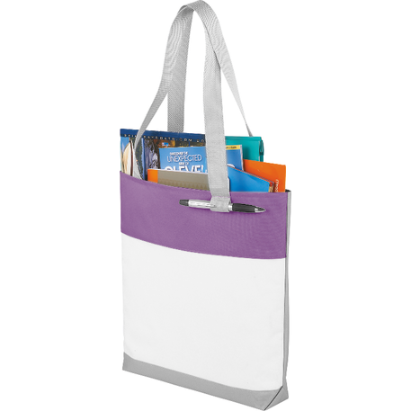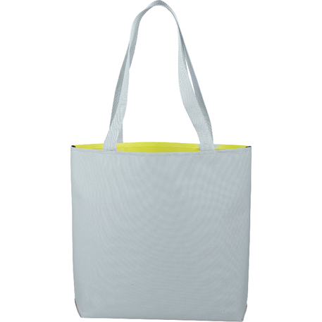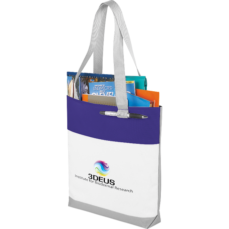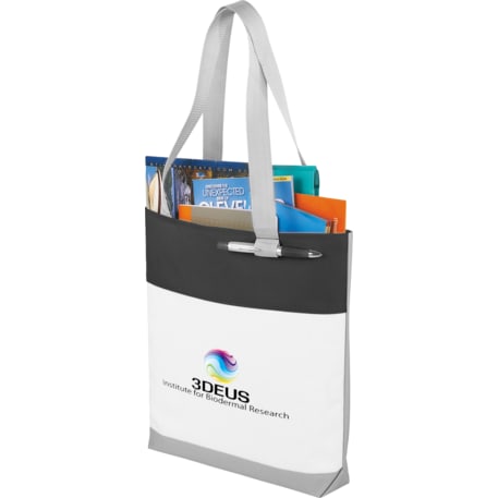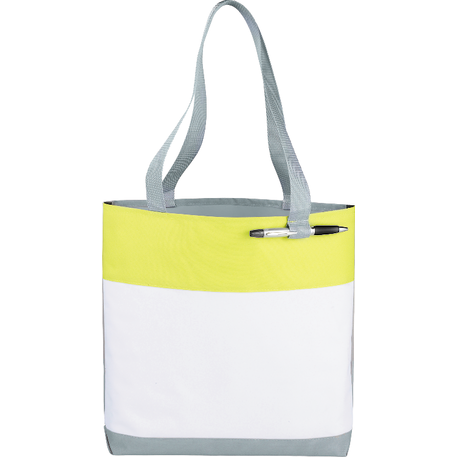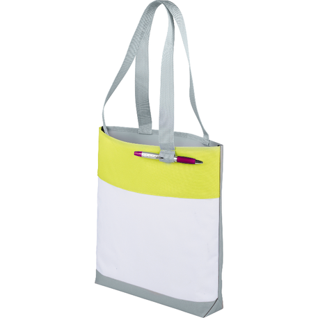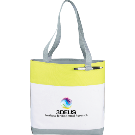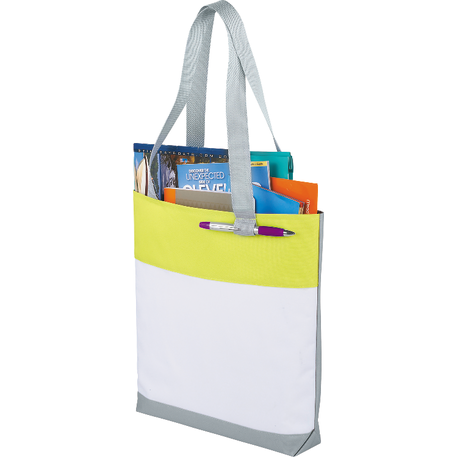 Part of the Split Decision Trend Collection. Fresh budget tote style for tradeshows, conventions, and business meetings features refreshing hues and the popular color dip trend. Open main compartment. Pen loop. 12" handle drop height.