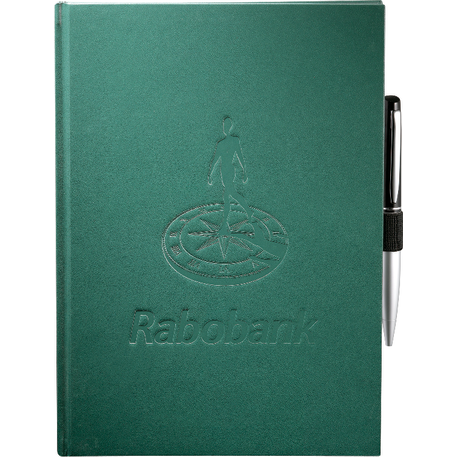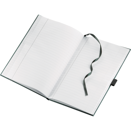 Hard cover, bound journal. Elastic pen loop. Ribbon page marker. Includes 72 sheets of white lined paper. Pen is not included.