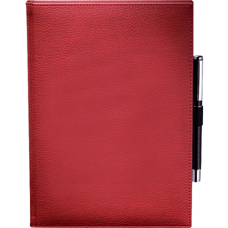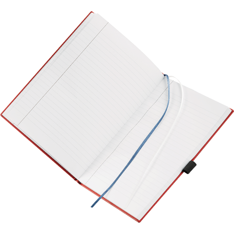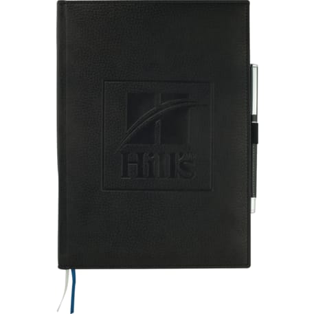 Hard cover, pebble grain bound journal. Elastic pen loop. Blue and silver ribbon page markers. Includes 96 sheets of white lined paper.Pen is not included.