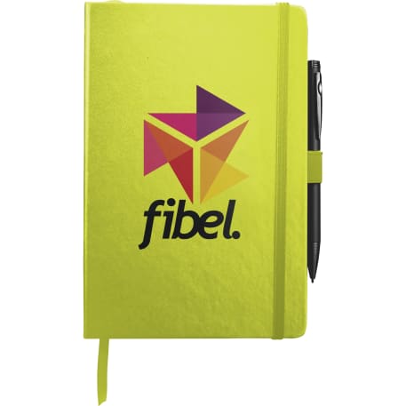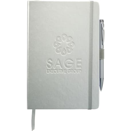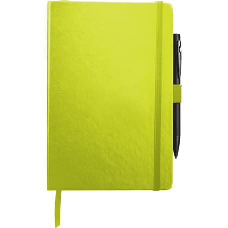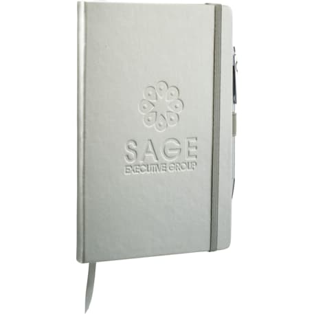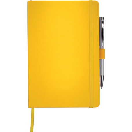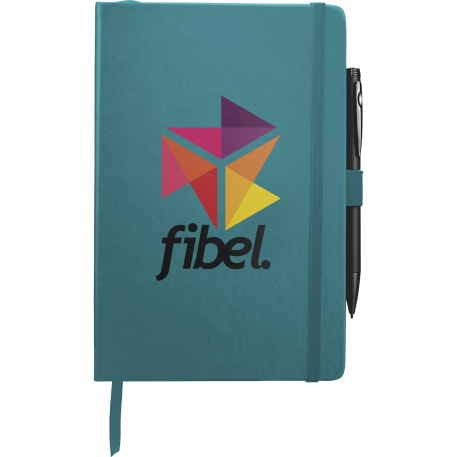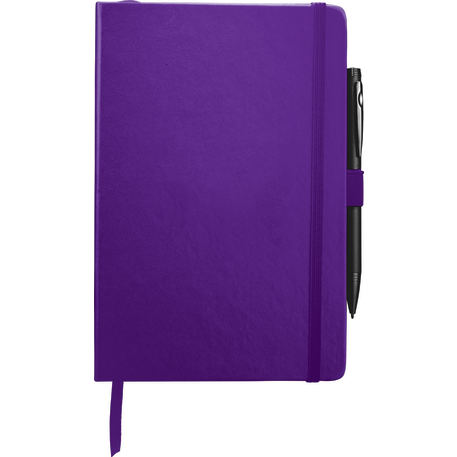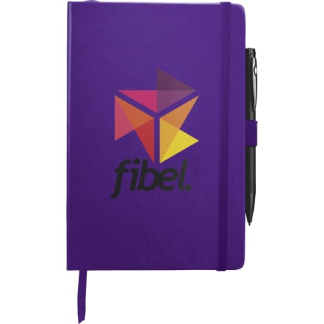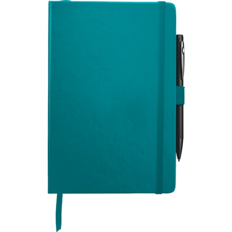 The 5.5" x 8.5" FSC Mix Nova Bound JournalBook® features a faux leather like, hard cover with built-in elastic closure, ribbon page marker, and expandable accordion pocket. Includes 96 sheets of lined white paper. Pen is not included.