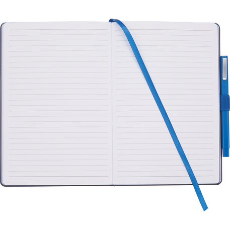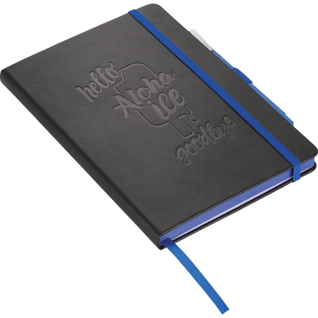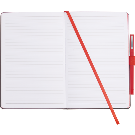Faux leather like, hard cover bound journal with built in elastic closure. Color accent painted edge paper, elastic pen loop and ribbon page marker. Back document pocket. Includes 96 sheets of white lined paper. Pen is not included.