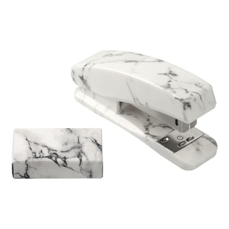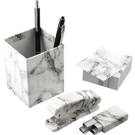 Add some style to your desk with this retail inspired 4 Piece Faux Marble Desktop Set. The marbleized set includes a pen cup, stapler, staple refills and note pad.