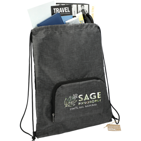 The Ash Foldable Recycled Drawstring Bag features a cinch closure main compartment. This drawstring has a zippered front pocket that the bag can easily fold up into for easy grab-n-go. Made from recycled water bottles, this drawstring bag is part of our EcoSmart collection. Through a partnership with 1% For The Planet one percent of sales of this and all EcoSmart products will be donated to nonprofits dedicated to protecting the planet.