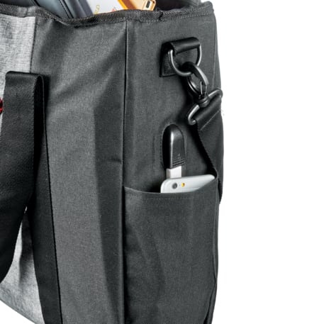 The Triad Zippered USB Tote is a stylish color-block tote with plenty of storage. This tote features a large zippered main compartment, a graphite front slash pocket and a side pocket. The adjustable, removable shoulder strap and side USB port with included USB cord make this bag a must when you’re on the go.