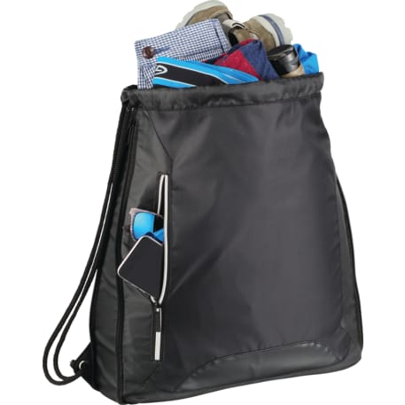 No combination will grant you access to your belongings with the Vault RFID Drawstring Sportspack. Be a 007, as you zip through the airport or sit in a meeting-with sleek, contemporary styling and Top-Secret design elements, you are covered with the Vault RFID Security bags. Open main compartment with slash pocket on the interior wall with drawstring closure. Deluxe drawstring cords. Large front zippered pocket for all of you essentials. On the back there is a hidden RFID pocket to protect against identity theft of your credit cards and passport. Expandable gussets to accommodate all of your belongings. Webbing grab handle.