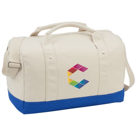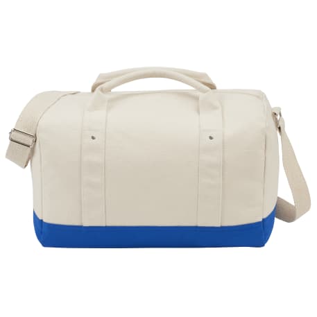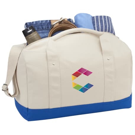 The Belair Cotton Canvas 17" Duffel shows off fun color-blocking and natural cotton canvas. This tote features zippered main compartment, cotton webbing shoulder strap and cotton grab handles. This duffel makes a great companion whether it's a short weekend getaway or a trip to the gym.