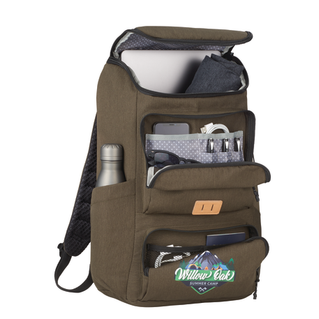 NBN stands for "No Brand Needed." The NBN Trails 15” Computer Backpack is an on-trend backpack designed to support your every need. This backpack features a 15” padded laptop sleeve in the large, zippered main compartment. The front vinyl lash tab and printed lining compliment the high quality material of this backpack. This backpack also includes a backboard for added structure, trolley sleeve, padded back and a side grab handle. Switch out the interchangeable zipper pullers for a custom look..