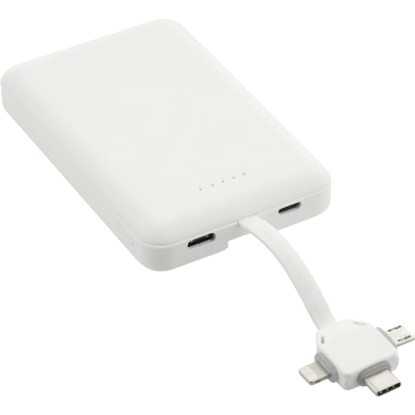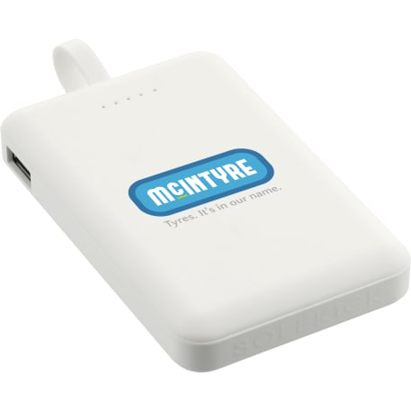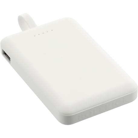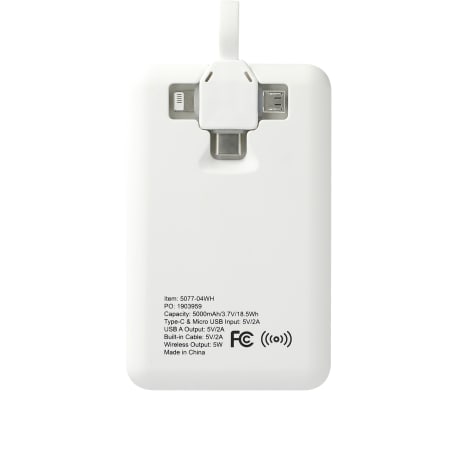 The Solekick™ 5000 Wireless Power Bank w/ 3-in-1 Cable features a 5,000 mAh/18.5Wh rechargeable lithium polymer battery, an integrated cable with Type-C tip, micro tip and 2-in-1 dual compatible tip for Android and Apple® iOS devices. It works as a 5W wireless charging pad or a regular power bank on the go. USB-A Output: 5V/2A. Tips Outputs: 5V/2A. To charge a phone without wireless technology, an external Qi-standard wireless charging receiver or receiver case is required. This device works with any smartphone or tablet – even ones without wireless technology – through the normal power bank capabilities. Works with most plastic phone cases on. Includes a 31-inch USB-A-to-Micro charging cable. Packaged in a FSC-certified premium gift box. Power banks are permitted in carry-on luggage only, and at the discretion of TSA agents. Please charge the power bank before initial use.