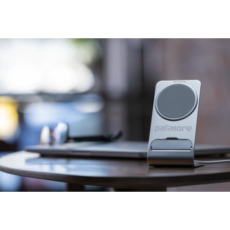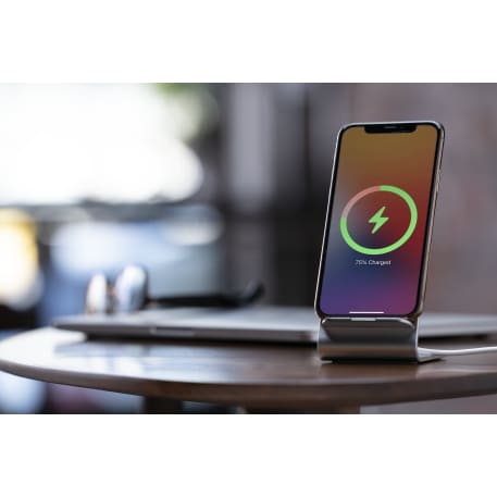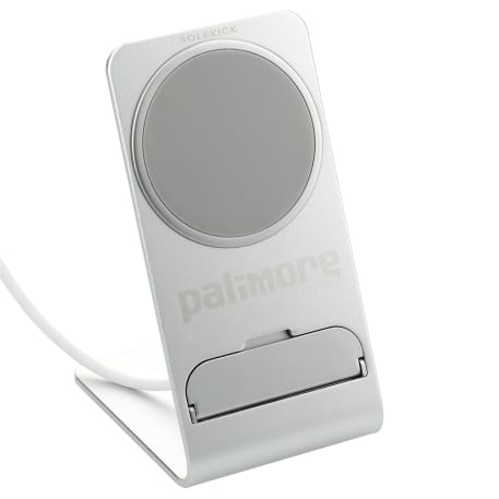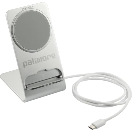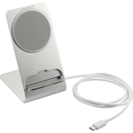 The Solekick™ MagClick™ Fast Wireless Charging Stand magnetically holds and wirelessly charge iPhone 12/13 models. For phones without magnetic function, pull out the stand piece to hold it in place for wireless charging. Supports three different wireless charging modes: 7.5W for iPhone X/8/8 Plus/XS/XS Max/XR/11/11 Pro/11 Pro Max/12/12 Pro/12 Pro Max/12 Mini/13/13 Pro/13 Pro Max/13 Mini; 10W for Samsung Galaxy S9/S9 Plus/S8/S8 Plus/Note 8/9 and more, and 5W standard charging for all other enabled devices. Includes a 39-inch integrated charging cable with Type C tip. For fast charging, a 20W Type-C power adapter is recommended. (7143-23 sold separately) Packaged in a FSC certified premium gift box.