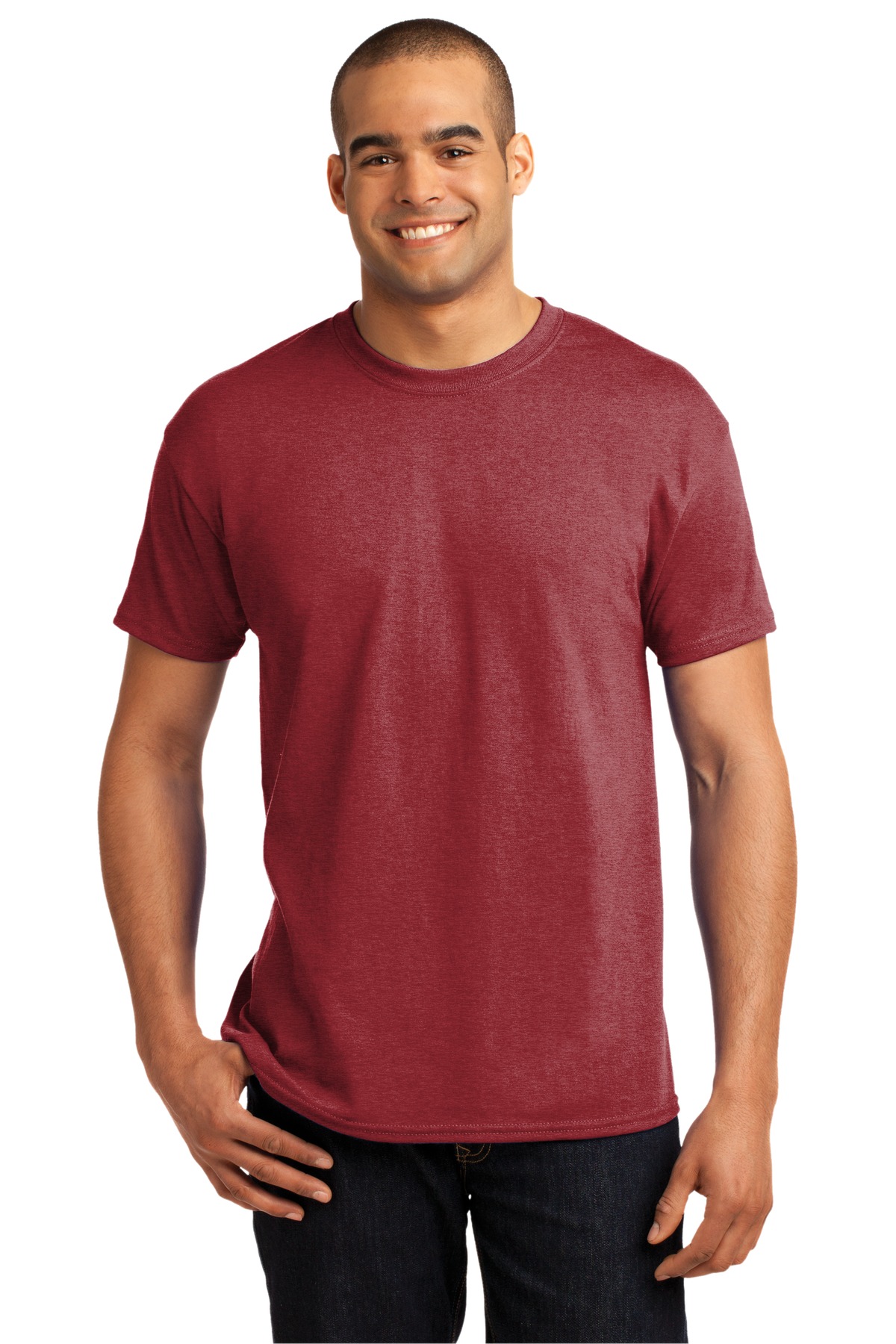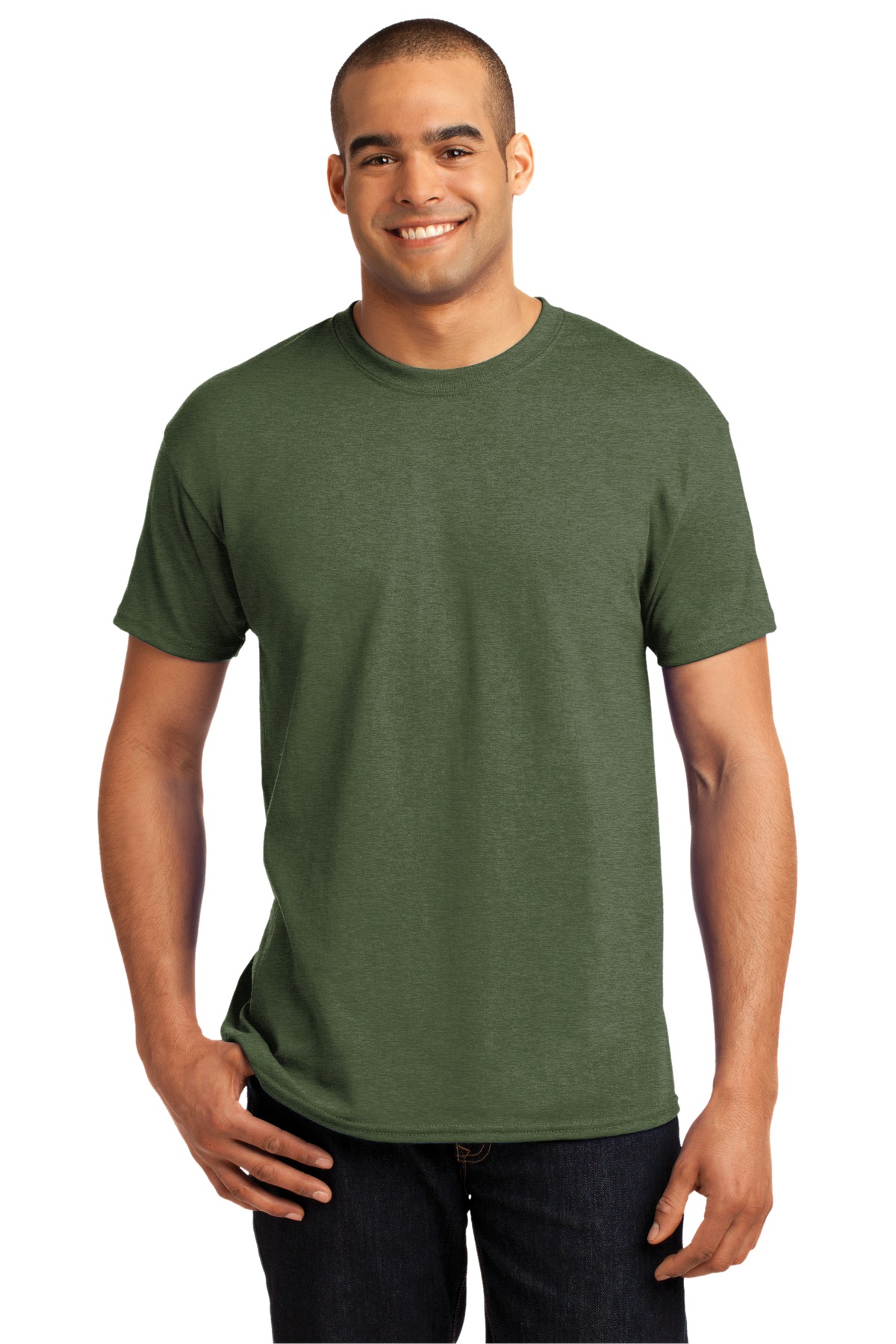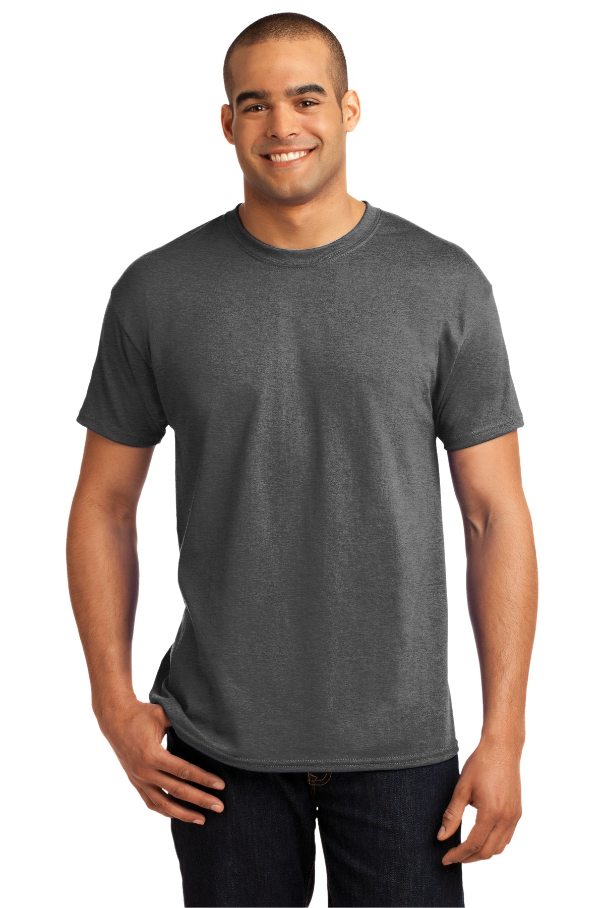 5.2-ounce 50/50 cotton/polyMade with up to 5% recycled polyester Taped neck and shoulders Double-needle coverseamed crewneckLay-flat collarTear-away label Double-needle sleeves and hemPlease note: This product is transitioning from tagless and tagged labels to tear-away labels. Your order may contain a combination of labels.
