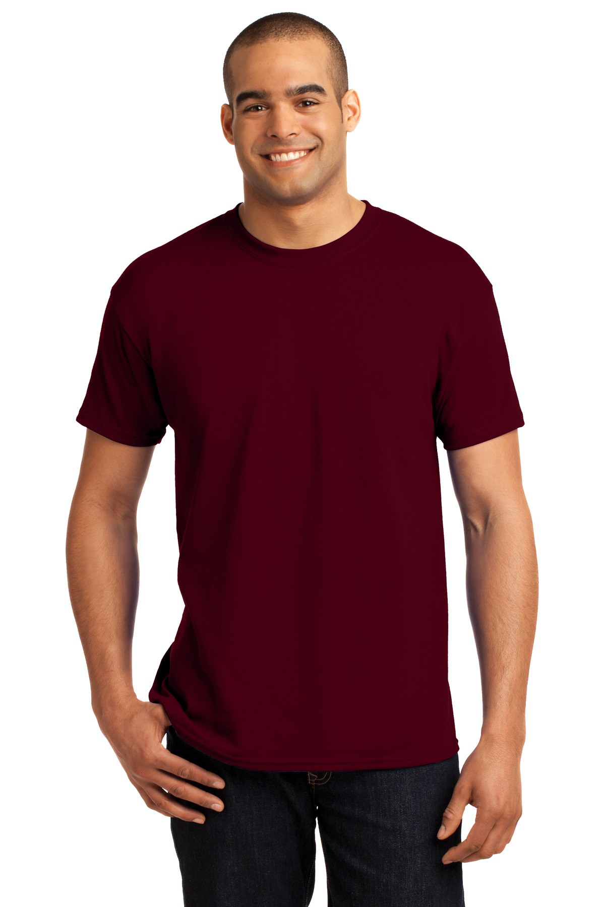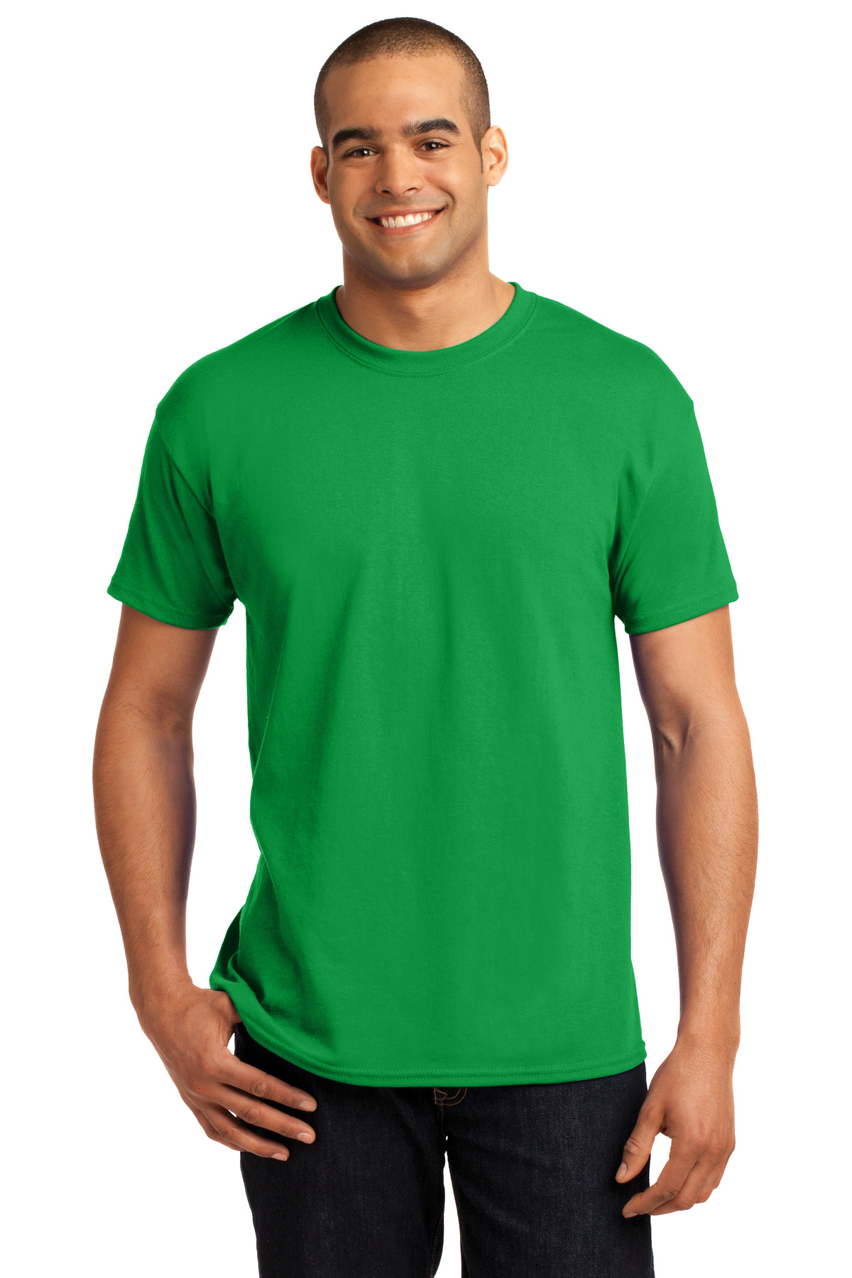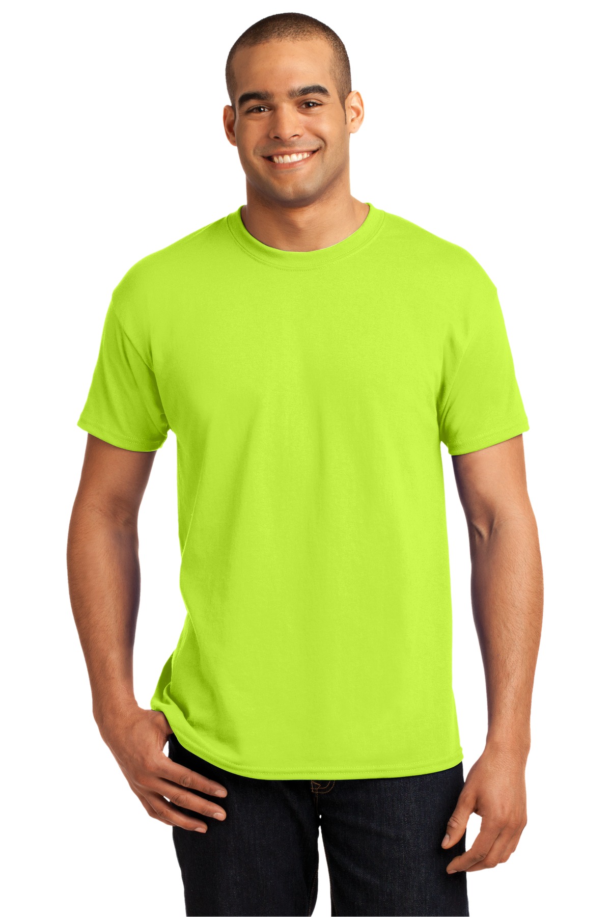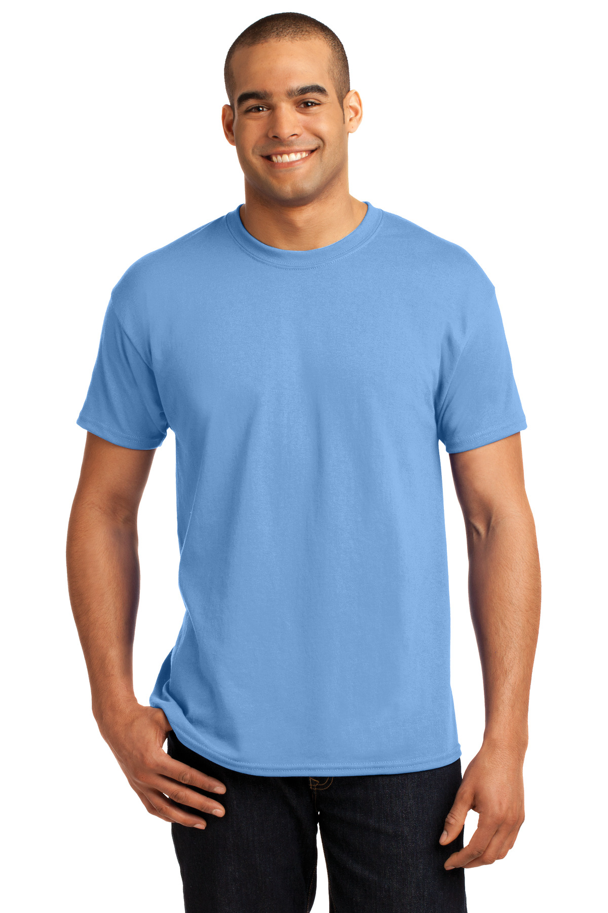 5.2-ounce 50/50 cotton/polyMade with up to 5% recycled polyester Taped neck and shoulders Double-needle coverseamed crewneckLay-flat collarTear-away label Double-needle sleeves and hemPlease note: This product is transitioning from tagless and tagged labels to tear-away labels. Your order may contain a combination of labels.