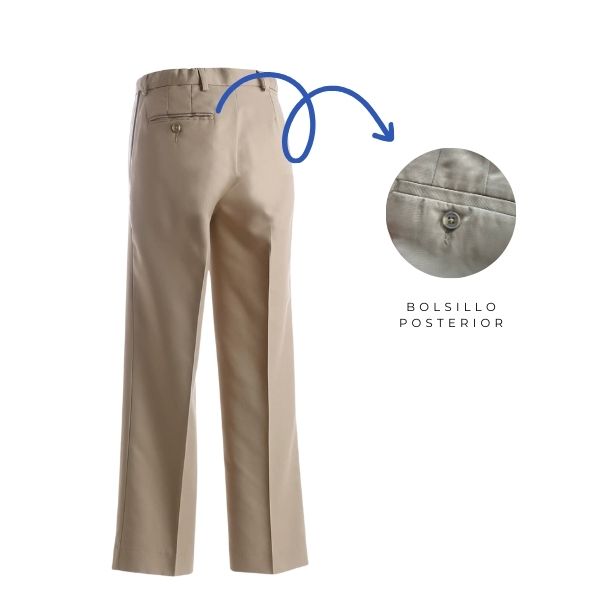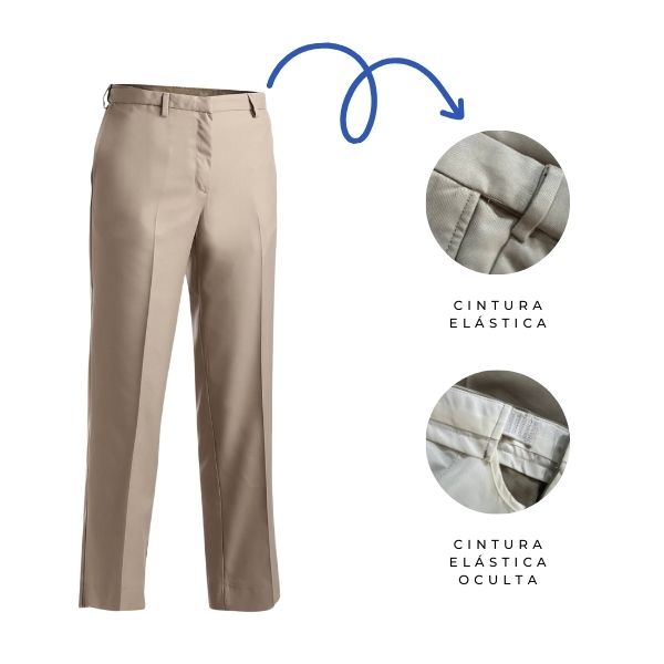- Pantalón de corte tradicional con frente delantero plano y cinturilla de fácil ajuste.