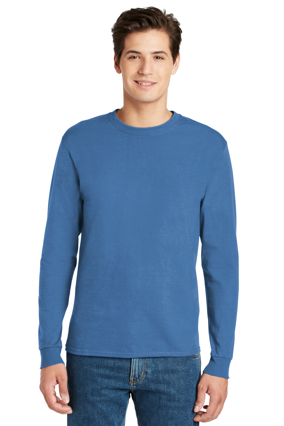 6-ounce 100% ComfortSoft cotton 99/1 cotton/poly (Ash)90/10 cotton/poly (Light Steel) Tagless label Lay-flat collar Double-needle coverseamed neck Shoulder-to-shoulder taping Rib knit cuffsPlease note: This product is transitioning from tagged labels to tag-free and orders may contain a combination of both.