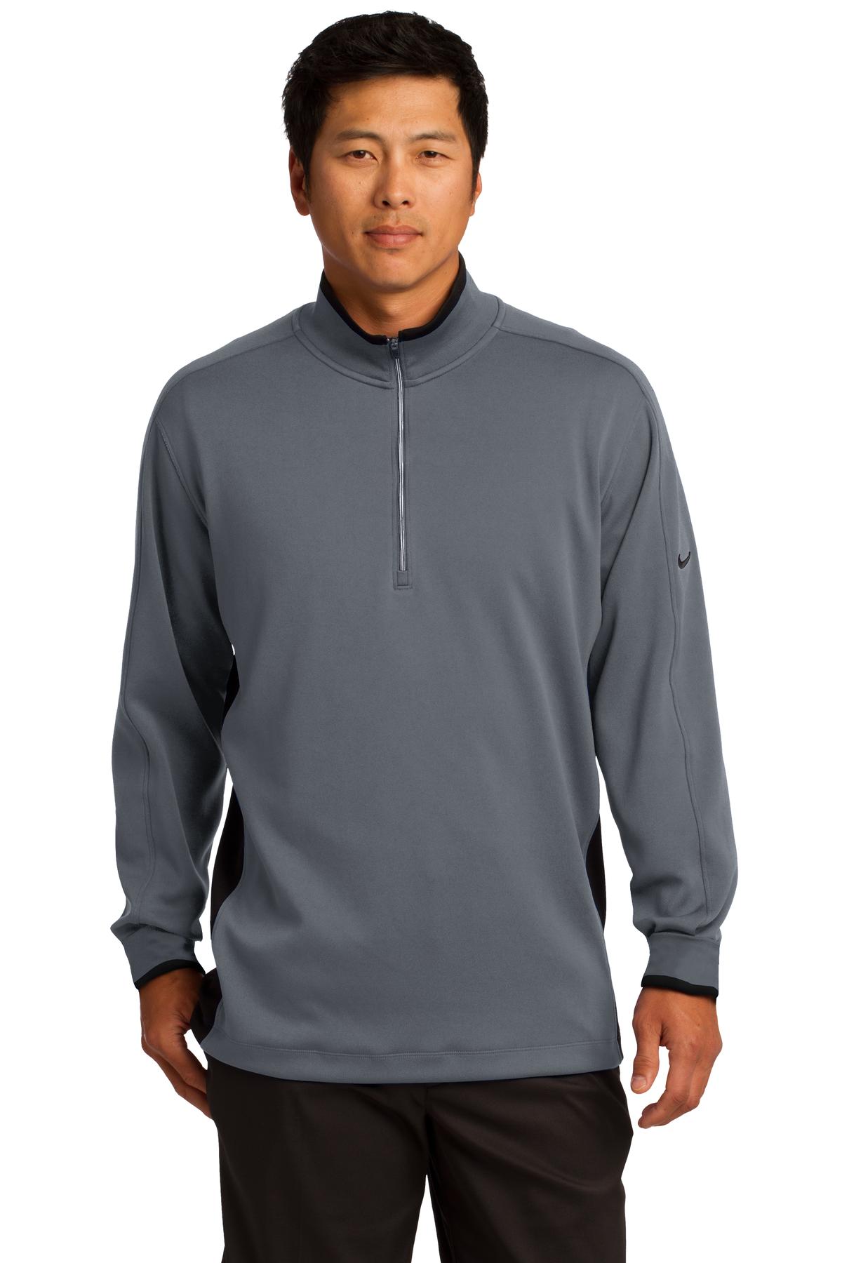 A boldly striped inner collar and reverse coil zipper give this cover-up an edge. Of course it also performs with Dri-FIT moisture management technology. The design features a flat knit collar and cuffs and an open hem. The contrast Swoosh design trademark is embroidered on the upper left sleeve. Made of 8.3-ounce 100% Dri-FIT polyester.
