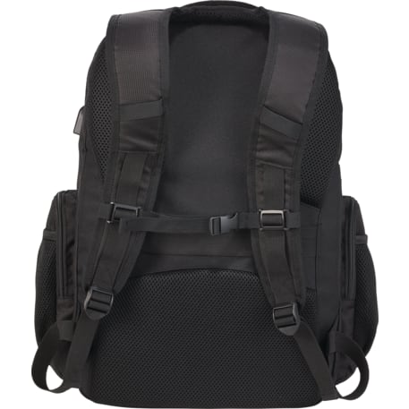 The Rainier TSA 17" Computer Backpack features a large zippered main compartment that offers ample room for all of your tech accessories and tablets. Main compartment has built in USB port and cable which allows for seamless charging capabilities of your tech products inside the backpack. Includes a 17 inch TSA computer compartment that unfolds to lay flat on the X-ray belt to increase speed through security. Additional storage on the front panel of the bag include a deluxe organizational panel, easy access top pocket compartment and two zippered side pockets with mesh water bottle pockets. Custom zipper pullers, padded back panel, chest strap and trolley sleeve.