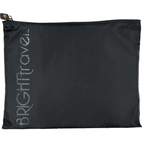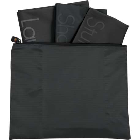 Rethink the way you travel. Discover a world of difference with BRIGHTtravels products that enable you to travel lighter and smarter. Four-piece set includes one zippered carrying bag that doubles as storage or use, one shoe bag (10"x16.5") [holds two shoes], one laundry bag (15.5"x20"), and one stuff bag (11"x10") [can hold an iPad or tablet]. Signature BRIGHTtravels branding. ADDED BONUS - Includes a Pack N’ Guide with the Top 5 packing tips to 'Pack Like A Pro'. NOTE: Black/Orange sku (BKOR) includes (1)blue colored laundry bag, (1) orange shoe bag and (1) green 'stuff' bag. The GYBK sku contains only black colored bags.