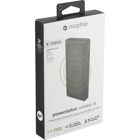The mophie® Powerstation Wireless XL with PD Power Bank has a rechargeable 10,000 mAh/37W lithium polymer battery that works as a charging pad or a regular power bank on the go. The 18W USB-C port provides enough power to charge a laptop with a Type-C port and enough power to fast charge compatible devices with wired charging. The power bank can charge three devices at the same time by using Type-C port, USB-A port and wireless charging surface simultaneously. To charge a phone without wireless technology, an external Qi-standard wireless charging receiver or receiver case is required. Works with most plastic phone cases on. Includes a USB-A to Type C charging cable. Packaged in a premium gift box. Power banks are permitted in carry-on luggage only, and at the discretion of TSA agents. Qi Certified. Please charge power bank before initial use.