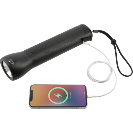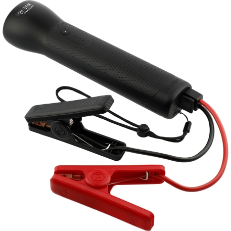The mophie® Powerstation Go Rugged Flashlight has a 9,900 mAh/36.6Wh rechargeable lithium battery and doubles as a power bank with one USB-A output. In addition to its ultra-bright, 450-lumen LED bulb and LED work light, this flashlight features SOS mode and a high-visibility red light for emergencies. It even includes jumper cables that can jump start a full-sized truck and 12V vehicle batteries in seconds. It also includes a UL-listed AC wall plug, carrying pouch and USB-A-to-Type-C cable. Packaged in a premium gift box. Power banks are permitted in carry-on luggage only, and at the discretion of TSA agents. Please charge power bank before initial use.