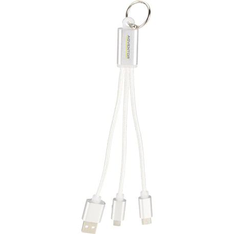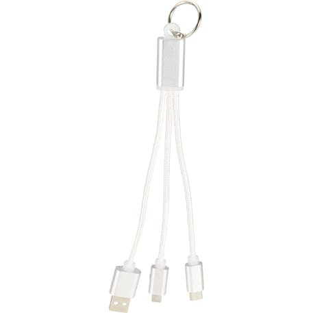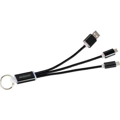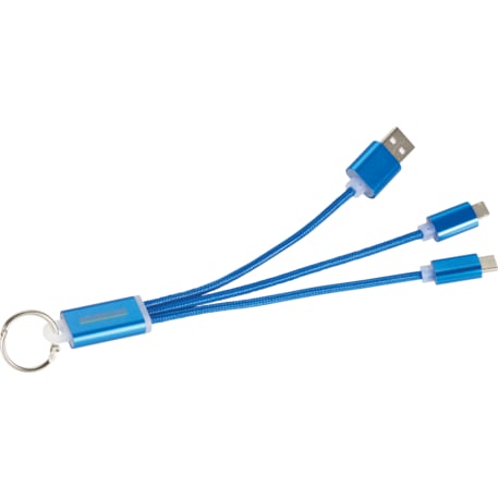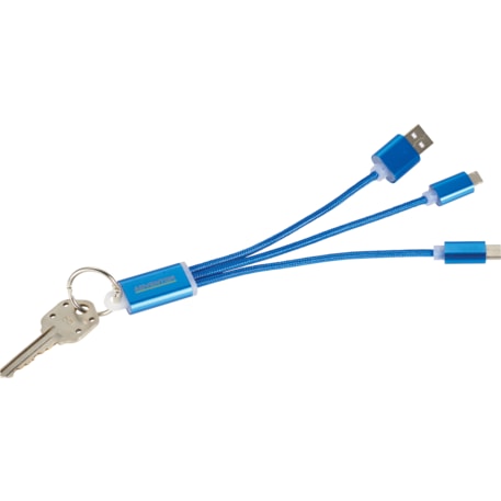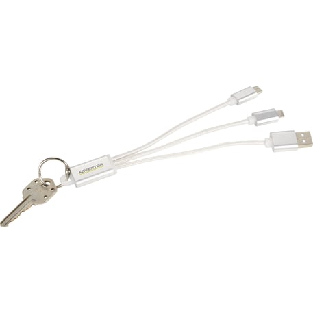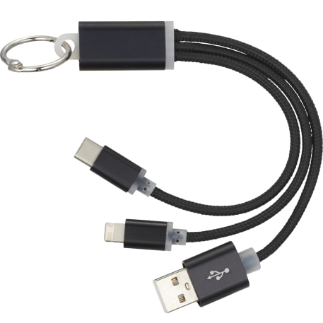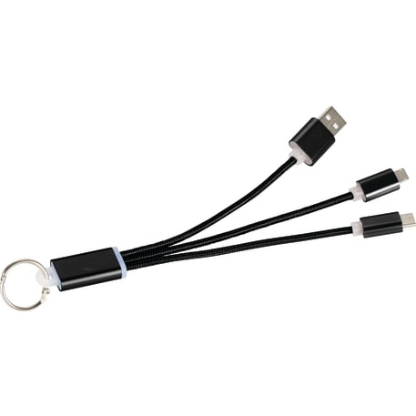 The Metal 3-in-1 Charging Cable consists of Type-C tip, and 2-in-1 dual compatible tip for charging both Apple iOS and Android devices with 1A current. Not compatible with iPad Pro. It also has key ring.