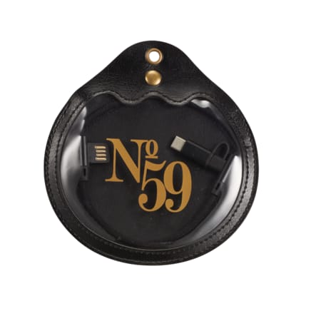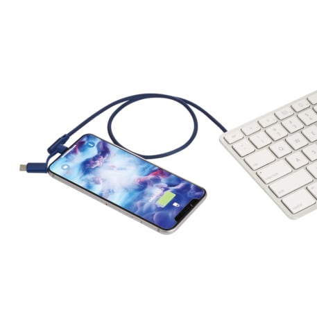 The Abruzzo 3-in-1 cable is stored in a soft protective pouch. It is a double 90-degree nylon braided cable that contains a USB type C adapter and 2-in-1 dual compatible adapter for both Apple iOS and Android devices. Not compatible with iPad Pro. Supports both charge and data transfer. Cable length is 20 inches.