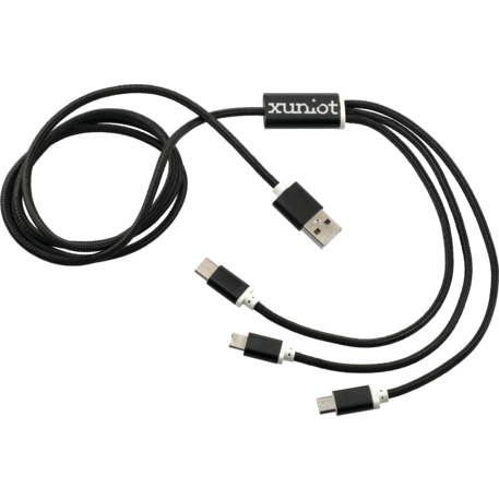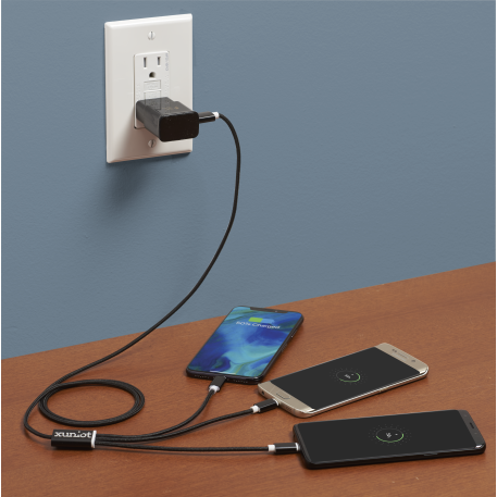 The Realm 3-in-1 Charging Cable comes with USB A tip on one side and a Micro tip, a type C tip, and 2-in-1 dual compatible tip for both Apple iOS and Android devices. It is 47 inches long. Supports charge of 2A current.