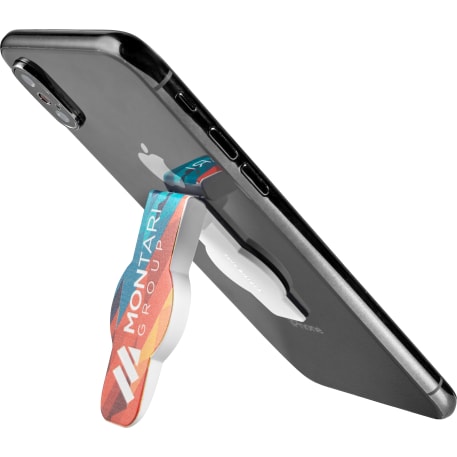 Patent Pending! This foldable stand can stick the back of your phone vertically or horizontally to prop your phone. Full color printing shows off any logo. This item comes with reusable glue which can be washed in water.